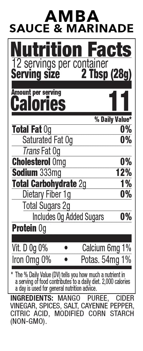 Mango Puree, Cider Vinegar, Spices, Salt, Cayenne Pepper, Citric Acid, Modified Corn Starch (non-GMO).